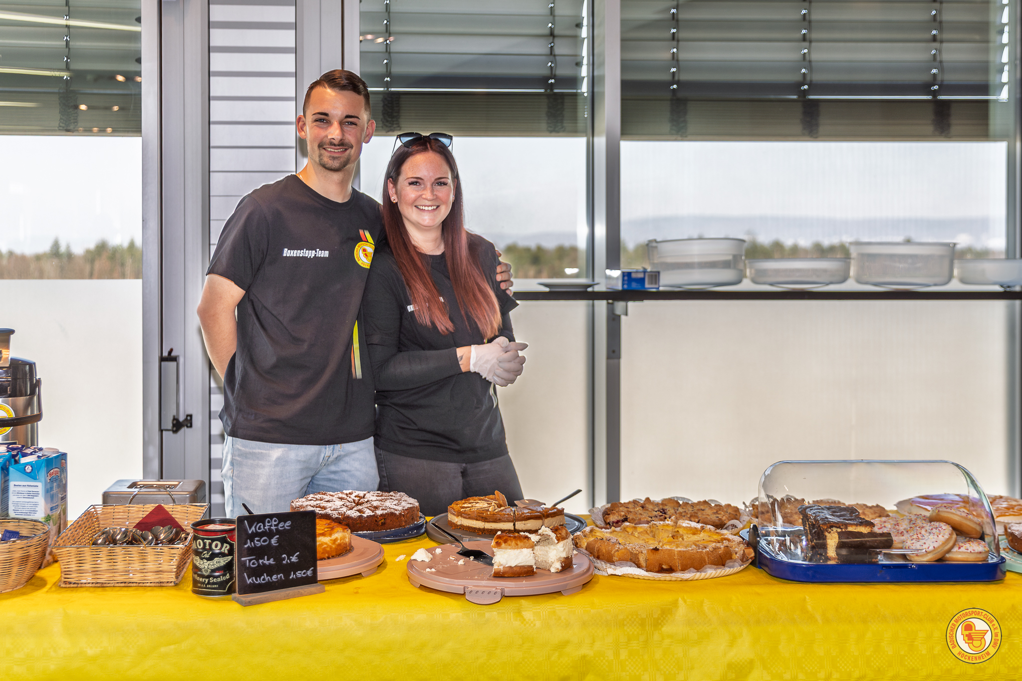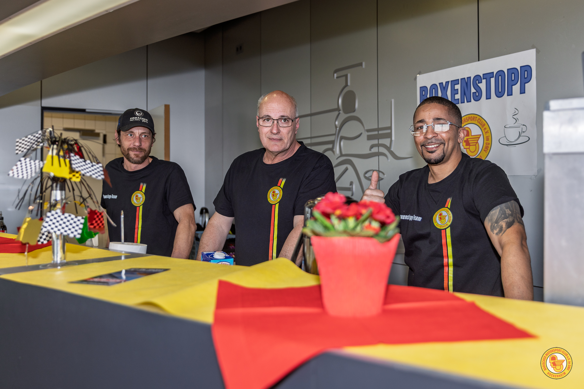 Auch für die Verpflegung war wieder hervor­ragend gesorgt, was in dieser Form für einen Club alles andere als selbst­ver­ständlich ist. Das Boxen­stopp Team mit Bruno Lopes, Marco Fischer, Heike Schüssler, Michael Prudlik, Klaus Scheu­ermann, Franziska Greif, Dominic Schroth, Samuel Zizmann, Beate Koniezcna, Sebastian Kummer unter der Orga-Leitung Sarah Scheu­ermann (Beirat Non-Sporting-Events)
