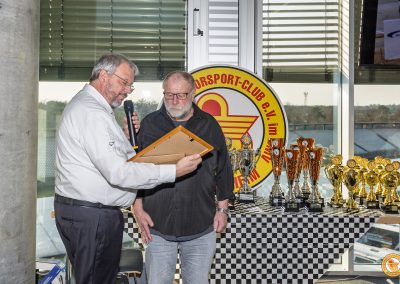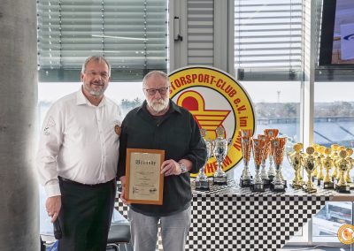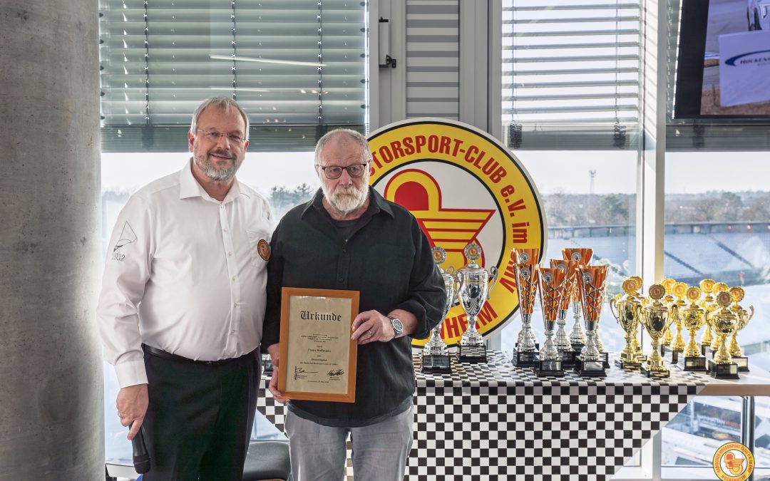 Ein beson­derer Höhepunkt waren die Ehrungen. Für beein­dru­ckende 60 Jahre Mitglied­schaft wurde Franz Hoffmann ausge­zeichnet und gleich­zeitig vom Präsidium einstimmig zum Ehren­mit­glied des BMC ernannt. Franz Hoffmann war über 30 Jahre als Presse­re­ferent des BMC Hockenheim tätig und prägte in dieser Zeit maßgeblich die Außen­dar­stellung des Clubs. Er erlebte die spekta­ku­lärsten Jahre des Motor­sports hautnah und reprä­sen­tierte den BMC mit seiner Arbeit in heraus­ra­gender Weise. Seine Bilder werden bis heute genutzt und sind ein bedeu­tender Teil der Geschichte des Vereins.