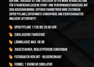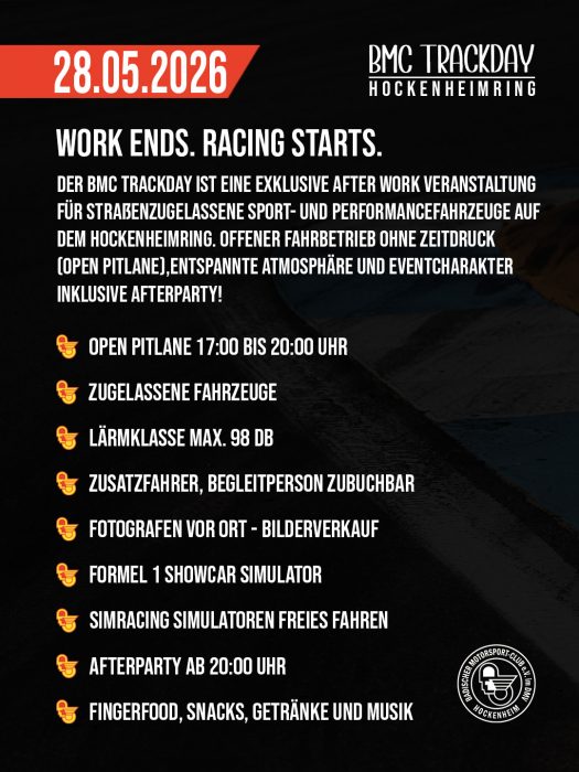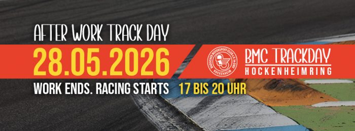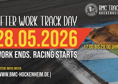 Der BMC Track Day – After Work ist eine Motorsportveranstaltung des Badischer Motorsport Club Hockenheim und richtet sich an alle, die ihr straßenzugelassenes Sport- oder Performancefahrzeug einmal außerhalb des öffentlichen Straßenverkehrs unter sicheren und kontrollierten Bedingungen bewegen möchten. Der Track Day ist bewusst kein Rennen. Es gibt keine Zeitnahme und keinen Wettbewerb. Im Mittelpunkt stehen Fahrspaß, Sicherheit und eine entspannte Atmosphäre auf einer der bekanntesten Rennstrecken Europas.